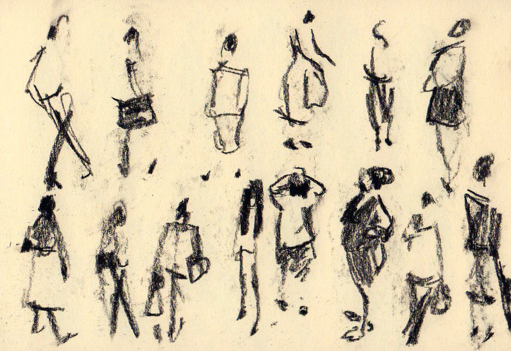 It was about here, at the end of my time, that it felt like things started to "happen." I became more efficient at getting the essential lines down quickly and with conviction. I see it best in the second drawing down, in the middle of the bottom row. I love the heavyset lady, the person to the left of her taking a photo, and the woman with the long black hair.